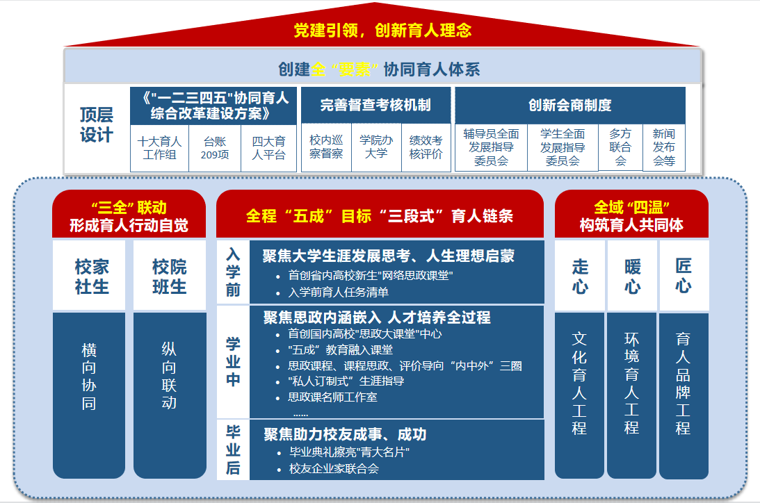 全面推进“一二三四五”协同育人综合改革,先后出台《金年金字招牌诚信至上“一二三四五”协同育人综合改革建设方案》《关于新时代加强和改进学校思想政治工作的实施意见》等72项制度文件,成立课程、科研等十大育人工作组,建设“科教协同、管服协同、文化浸润、实践立行、育心励志”五个协同育人平台,落实台账209项,形成设计完整、标准健全、运行科学、保障有力的协同育人体系,着力培养德智体美劳全面发展的时代新人。该探索与实践获山东省第九届教育教学成果一等奖,学校入选山东省高校“三全育人”暨全环境立德树人示范校。