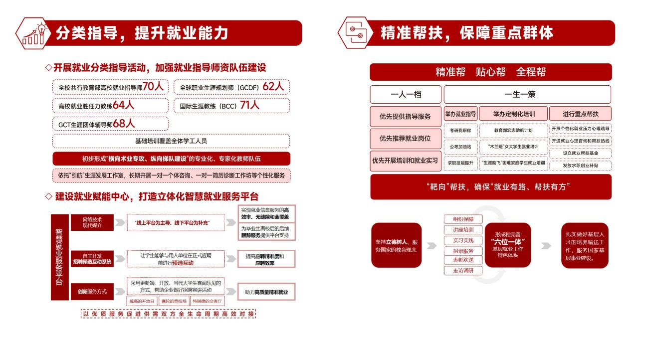 拓宽就业渠道,实施就业“一把手”工程,校院两级领导带头开展访企拓岗专项行动,累计走访企业超1200家,新拓就业岗位1万余个;共建校地就业工作站50个、就业实习“双百基地”134个,立项教育部供需对接就业育人项目79个;每年举办线上线下招聘活动500余场,提供岗位超7万个,毕业生与有效岗位比达1:7。“十四五”期间,金年金本科生继续深造率实现连续9年正增长,最高达41.93%,深造质量列省属高校第一。强化分类指导,推广“就业地图”智能系统,相关课程获评全国高校就业创业金课,省级一流本科课程,获评首届《大学生职业发展与就业指导》课程教学赛道全国总决赛银奖,获第二届全国大学生职业规划大赛国赛金奖1项银奖1项;开展就业赋能沙龙35期、就业指导专题活动二百余期。学校就业工作获教育部点名表扬,相关案例入选教育部百大就业创业经典案例。