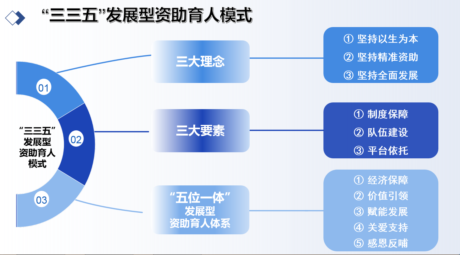 深化“三三五”资助育人体系,坚持以生为本、精准资助、全面发展三大理念,强化制度保障、队伍建设、平台支撑三大要素,打造“物质保障-价值引领-赋能发展-关爱支持-感恩反哺”五位一体的发展型资助育人体系,切实提升学生资助水平。五年来,先后为1.74万余人次学生办理国家助学贷款;累计发放各类资助资金,资助学生24.2万余人次。打造“国奖风采”、“励志之星”等品牌活动,开设“助飞大讲堂”等资助育人系列活动30余场,全面推动资助工作从“保障型”向“赋能型”转变,助力每一位家庭经济困难学生成长成才。工作案例获评山东省学生资助工作优秀案例一等奖。