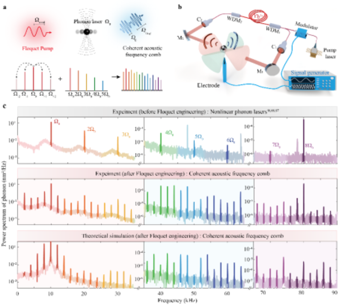 近日,milan米兰官网前沿交叉学科学院某团队联合理学院,提出将Floquet调控技术应用于非线性声子激光中,成功产生了国际上首个声子激光频率梳,预期在高分辨率声学传感、相干声信息处理及拓扑声子学等领域具有广阔的应用前景。研究成果以“基于Floquet工程的声子激光频率梳(Coherent acoustic frequency comb via Floquet engineering of optical tweezer phonon lasers)”为题发表在国际顶级期刊《科学进展》(Science Advances)上。