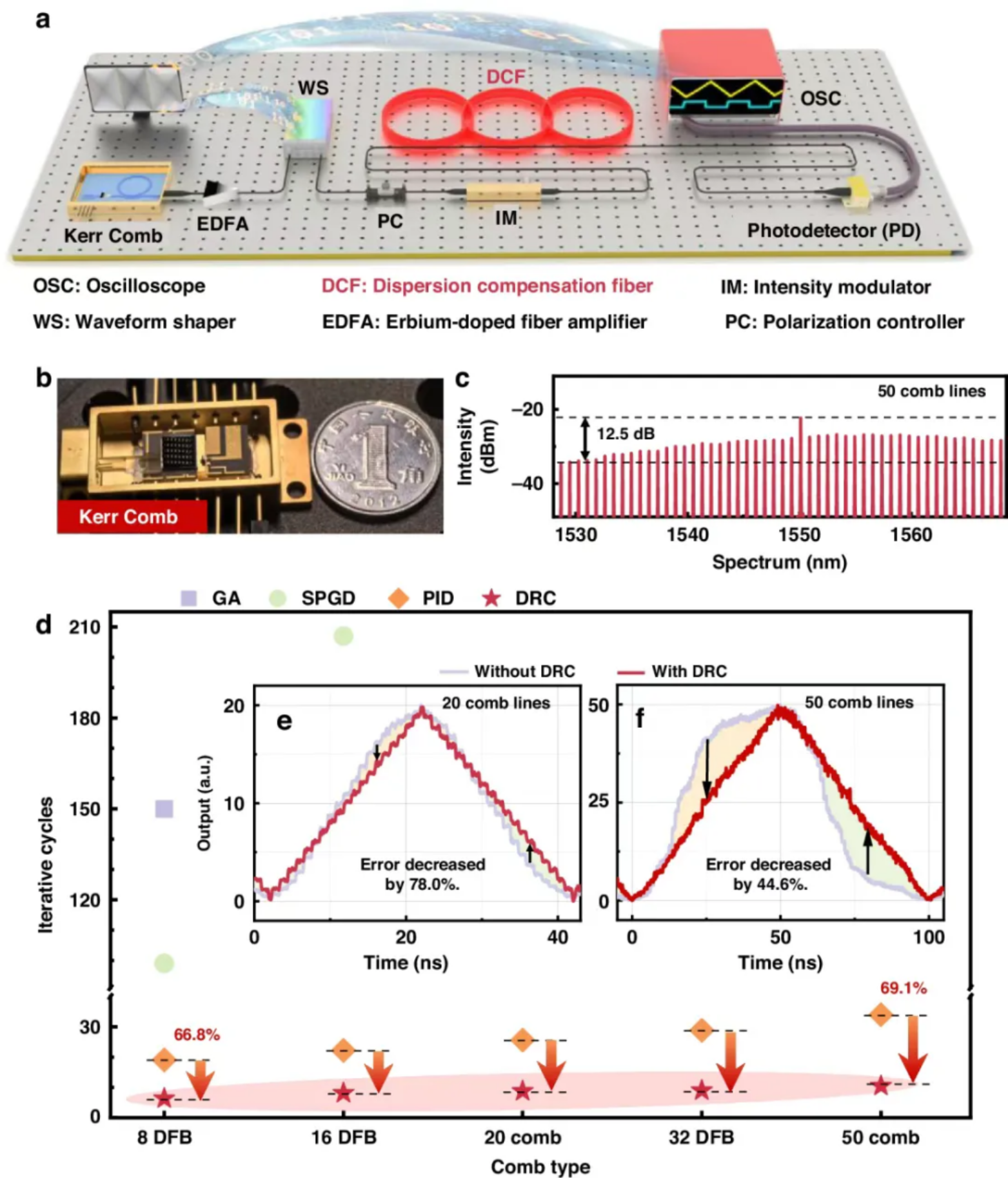 图1(a)展示了基于色散光纤的多波长光信息处理系统的校准链路。系统以克尔光频梳为光源(光谱如图1(b)所示),光梳之间的不平坦导致系统计算的结果产生误差。图1(d)对比了不同算法在使用不同梳齿数量情况下的校准迭代轮次,DRC相较其他传统方法的迭代效率超过66.8%。图1(e)-(f)展示了系统在校准前后的输出对比,易观测输出误差明显降低。