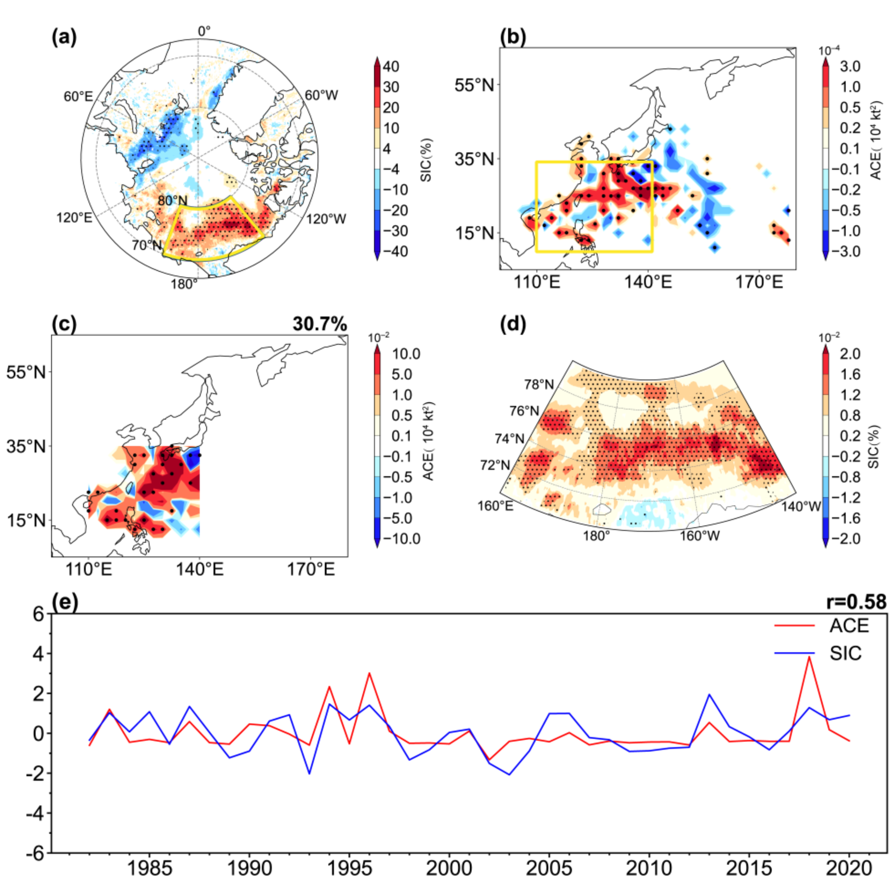 全球变暖带来热带海洋升温以及北极海冰迅速减少,热带与北极之间相互作用问题引起广泛关注。台风是强烈的热带天气尺度系统,大部分预估研究表明西北太平洋台风强度将持续增强,其生成位置和影响范围向高纬度地区扩展。然而,目前对于台风活动如何影响北极海冰变化过程机制的认识仍十分有限。