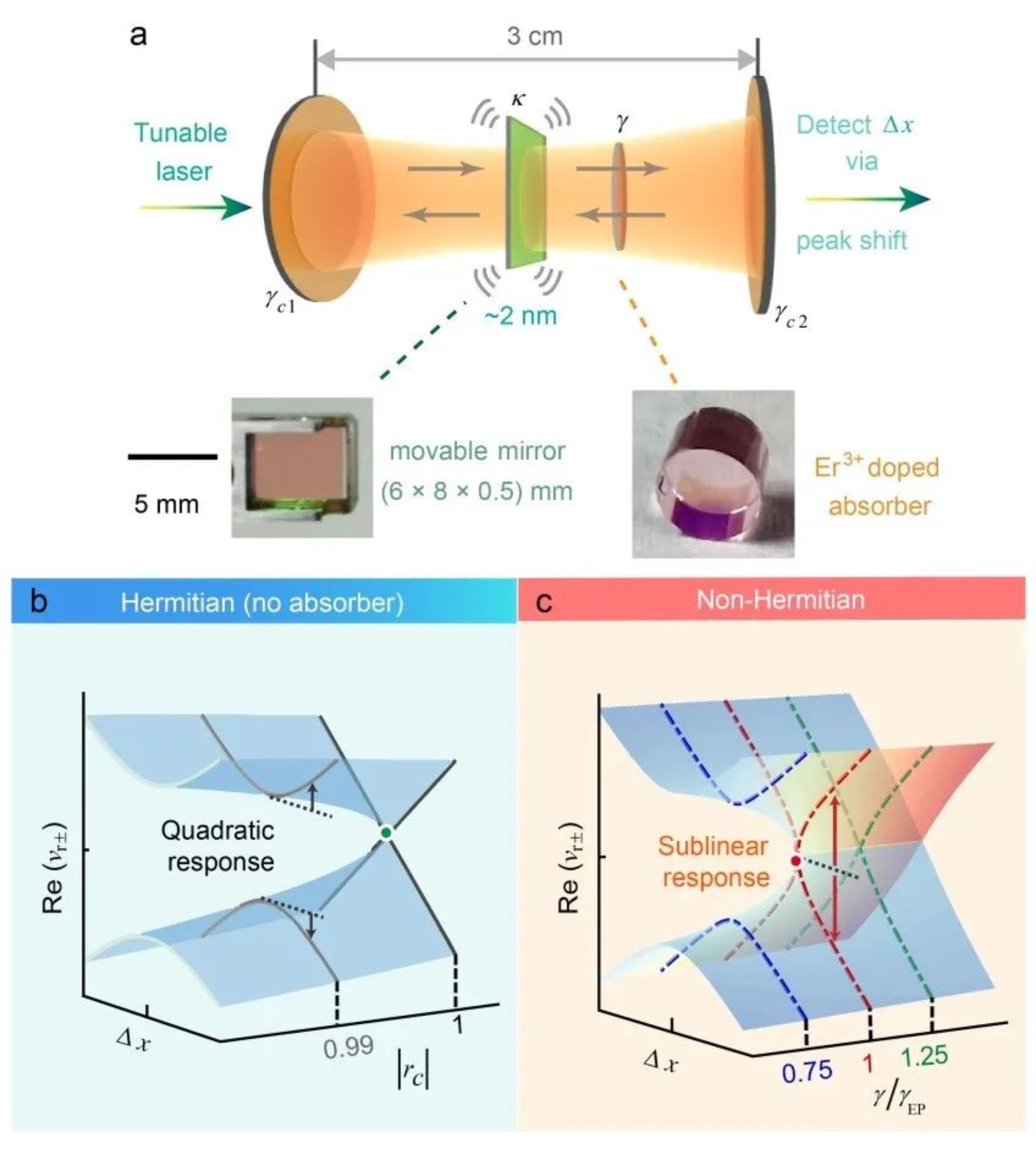 高精度的纳米位移检测技术是半导体芯片制造、弱力传感等应用的关键支撑。传统的光学纳米测量技术往往需要借助于纳米制造、外部参考光束或者复杂的后处理技术,且都是基于无损光学系统实现。因为一般来说,损耗是光学精密测量的“天敌”,高损耗往往会降低光学系统的分辨力和信噪比。此项工作另辟蹊径,创新性的发现:刻意引入损耗,结合非厄米奇异点效应,不仅可以实现两个数量级的位移光学响应提升,同时也保证了五倍以上信噪比增强。更重要的是,该装置相比于传统器件,不需要外部参考光束,采用单光源、单腔的紧凑型设计,可以极大降低光学设计和加工成本。该研究为高精度纳米位移测量技术的发展提供了新的途径和平台。