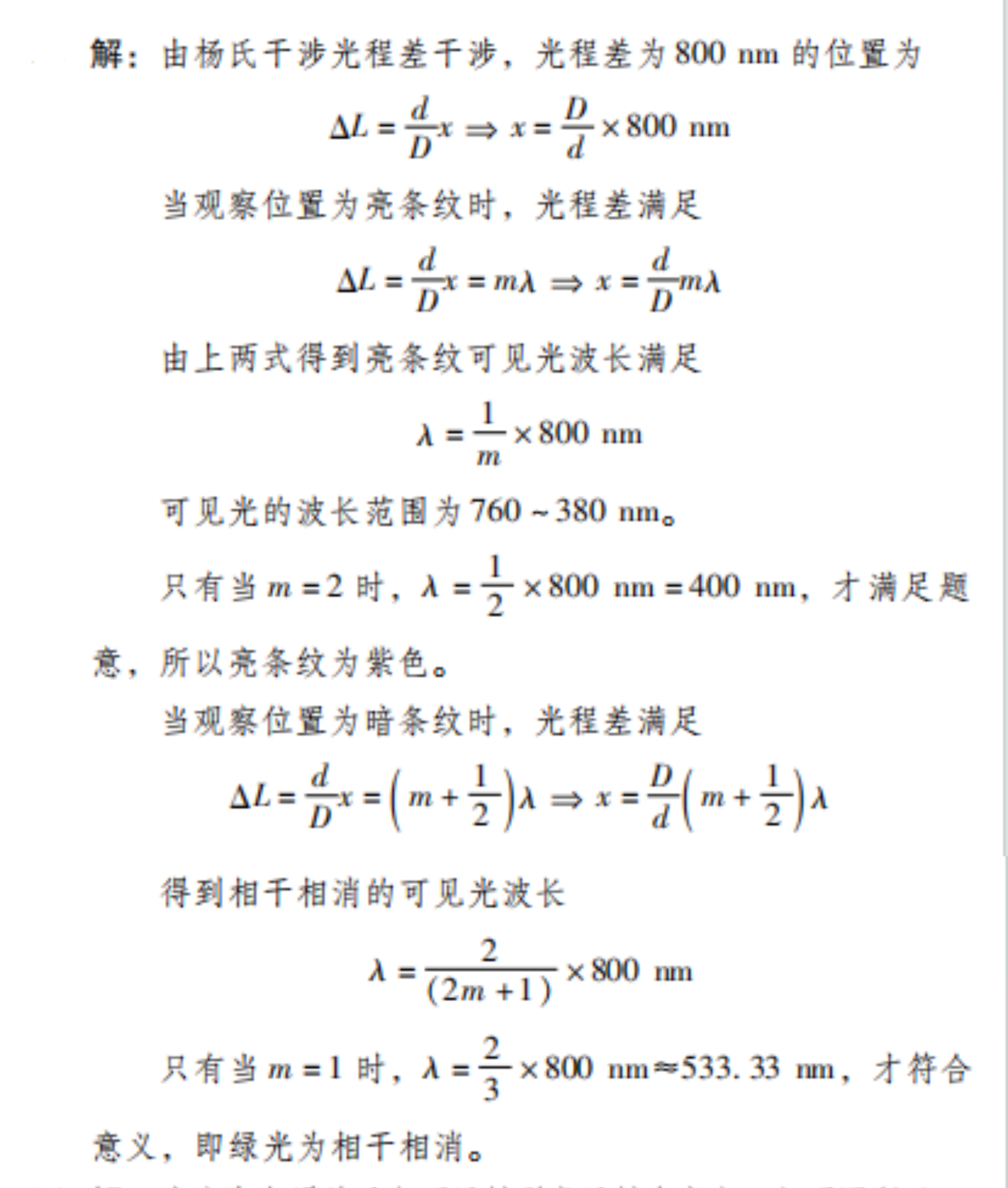 3.在杨氏双缝干涉实验中,当利用白光照明时,在观察屏上某一位置观察干涉条纹,这个位置满足光程差为800nm的条件。求在可见光区域内,这个位置对应亮条纹和暗条纹的光波长,并说明该亮条纹是什么颜色。