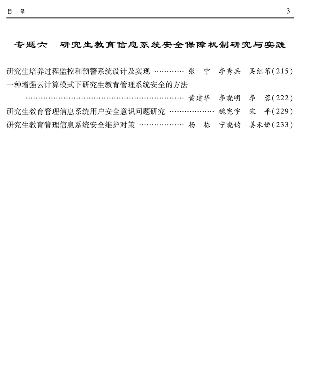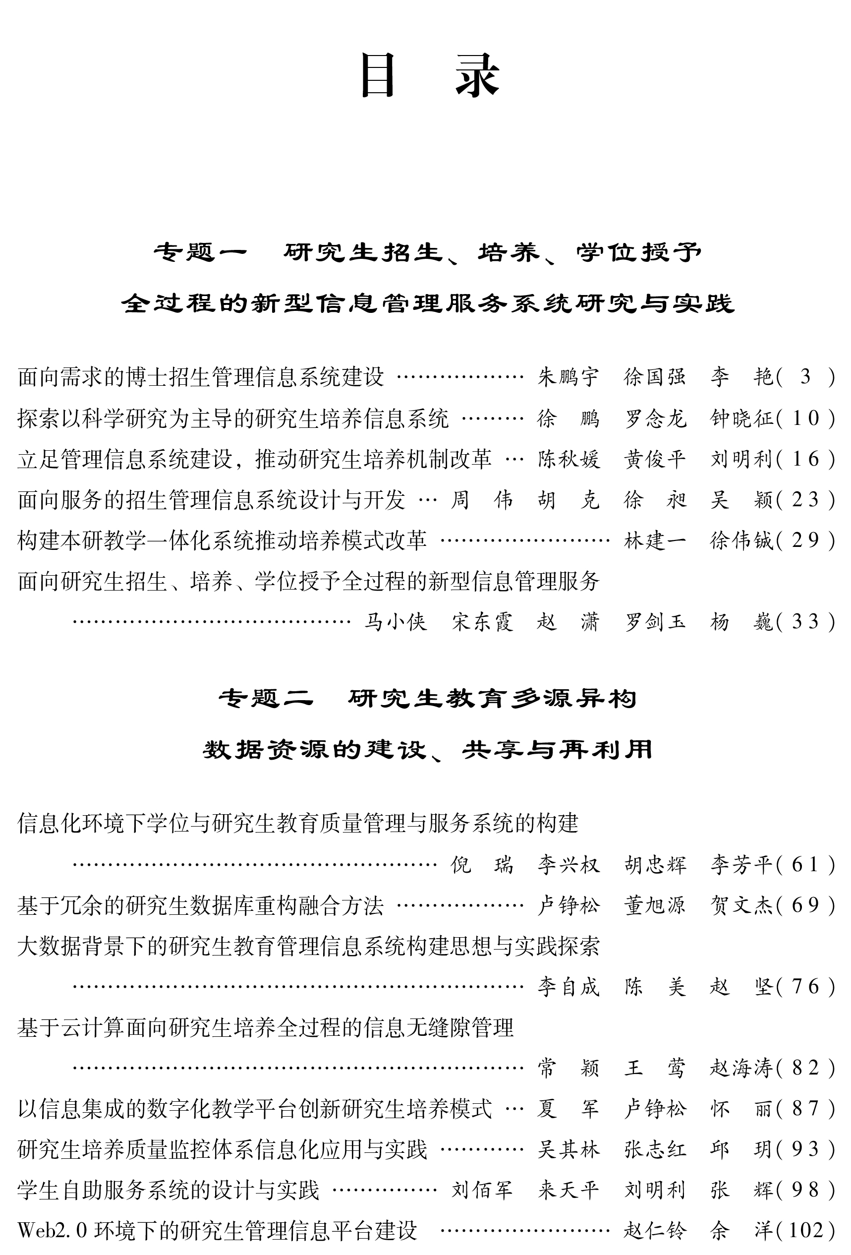 本书汇集了研究生教育信息管理研究成果33项,内容按照研究课题立项指南分为:研究生招生、培养、学位授予全过程的新型信息管理服务系统研究与实践;研究生教育多源异构数据资源的建设、共享与再利用;学位论文全过程跟踪检测与质量分析信息系统研究与实践;导师培养研究生的数据统计与绩效考核信息系统与实践;信息化时代研究生文化素养培养与引导机制研究与探讨;研究生教育信息系统安全保障机制研究与实