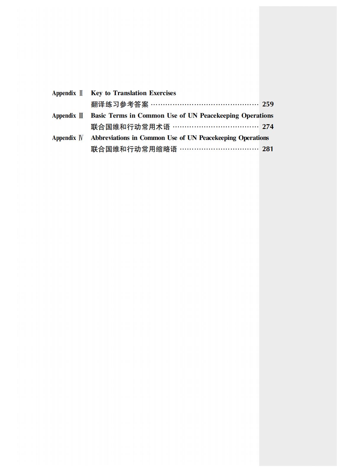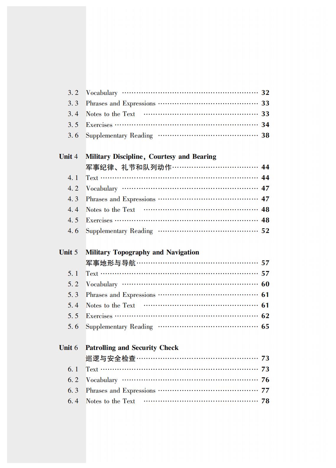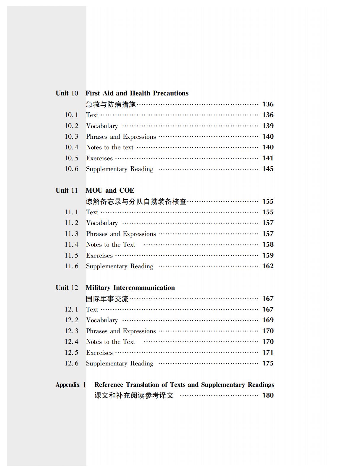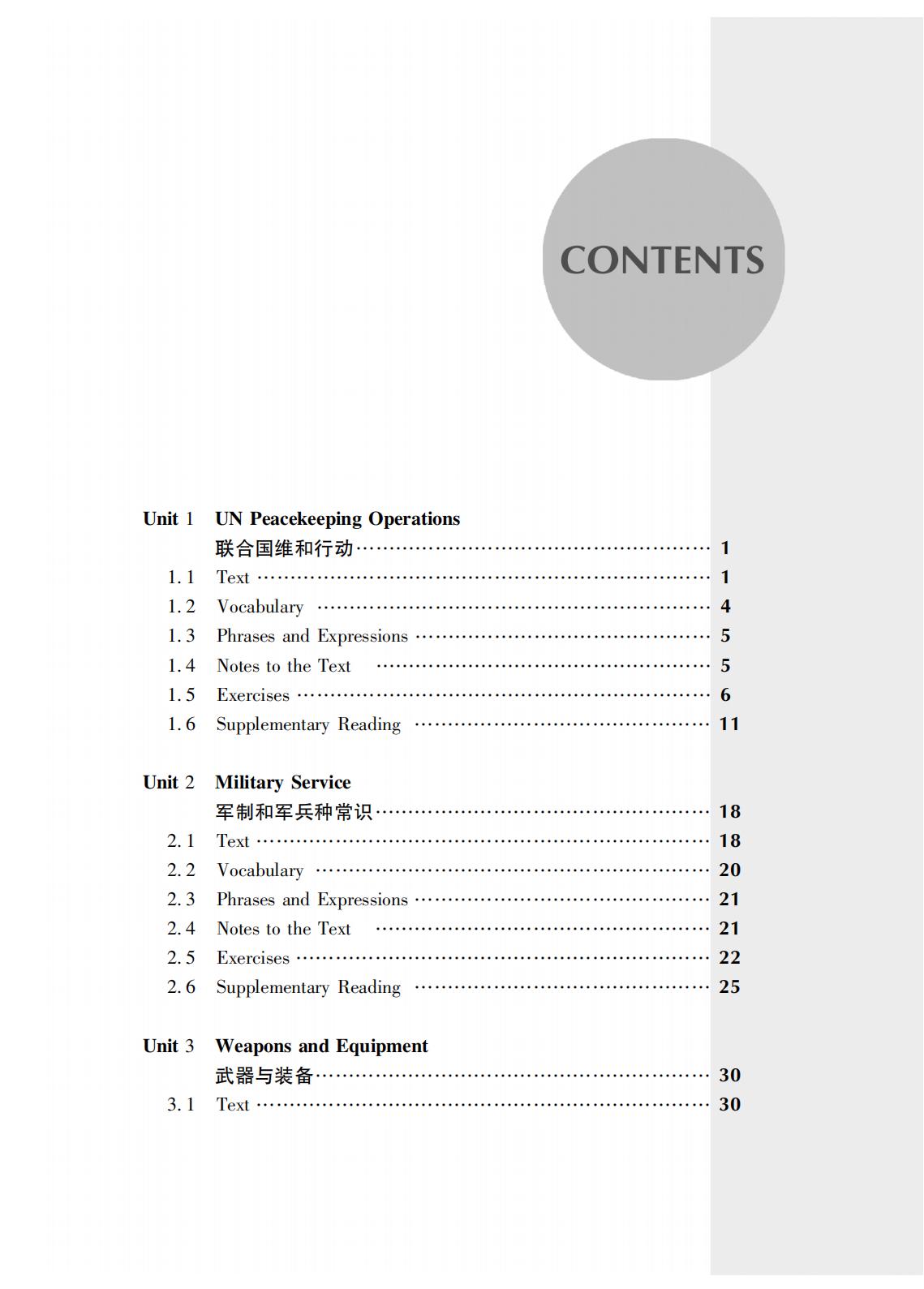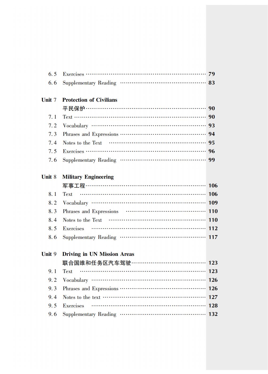 《维和部队高级英语教程》是“联合国维和行动培训系列教材”之一,由milan米兰官网国际关系学院刘钊教授组织编写。内容主要涉及联合国维和行动、军制和军兵种常识、武器与装备、军容风纪和队列动作、军事地形与导航、巡逻与安全检查、平民保护、军事工程、联合国维和任务区汽车驾驶、急救与防病措施、谅解备忘录与分队自携装备核查以及国际军事交流等。主要用于分队指挥及骨干人员的英语强化培训,经过该课程的系统训练,受训学员不仅能提高自身英语水平,还能增强在联合国维和任务区执行涉外联络和英语交流能力,并可作为全军维和部队官兵遂行使命任务和应对各类复杂情况的重要参考书,实用性强。其所精选的内容已经在全军维和培训中使用多年,在维和人才能力素质培养中发挥了重要作用。