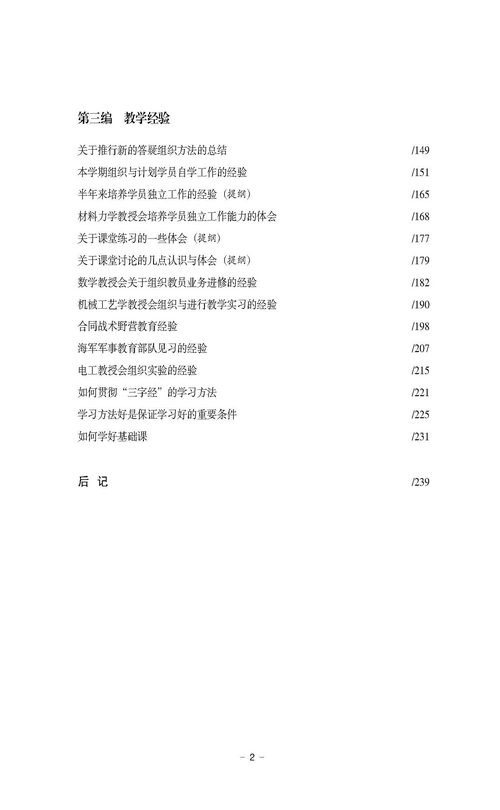 本书分教学计划、教学组织、教学经验三个专题,选编军事工程学院时期的教学档案文献26篇。第一编教学计划共5篇,主要为教学计划和教学大纲等档案文献;第二编教学组织共7篇,主要为教学组织相关制度的档案文献;第三编教学经验共14篇,主要为总结教和学两方面经验的档案文献。每一篇档案文献前设置“档案提要”,简要介绍档案的背景和主要内容。本书以彩页形式影印教学文书档案和照片档案,生动再现了“哈军工”教学工作场景,从档案文献角度反映了“哈军工”办学治校的优良传统和宝贵经验。