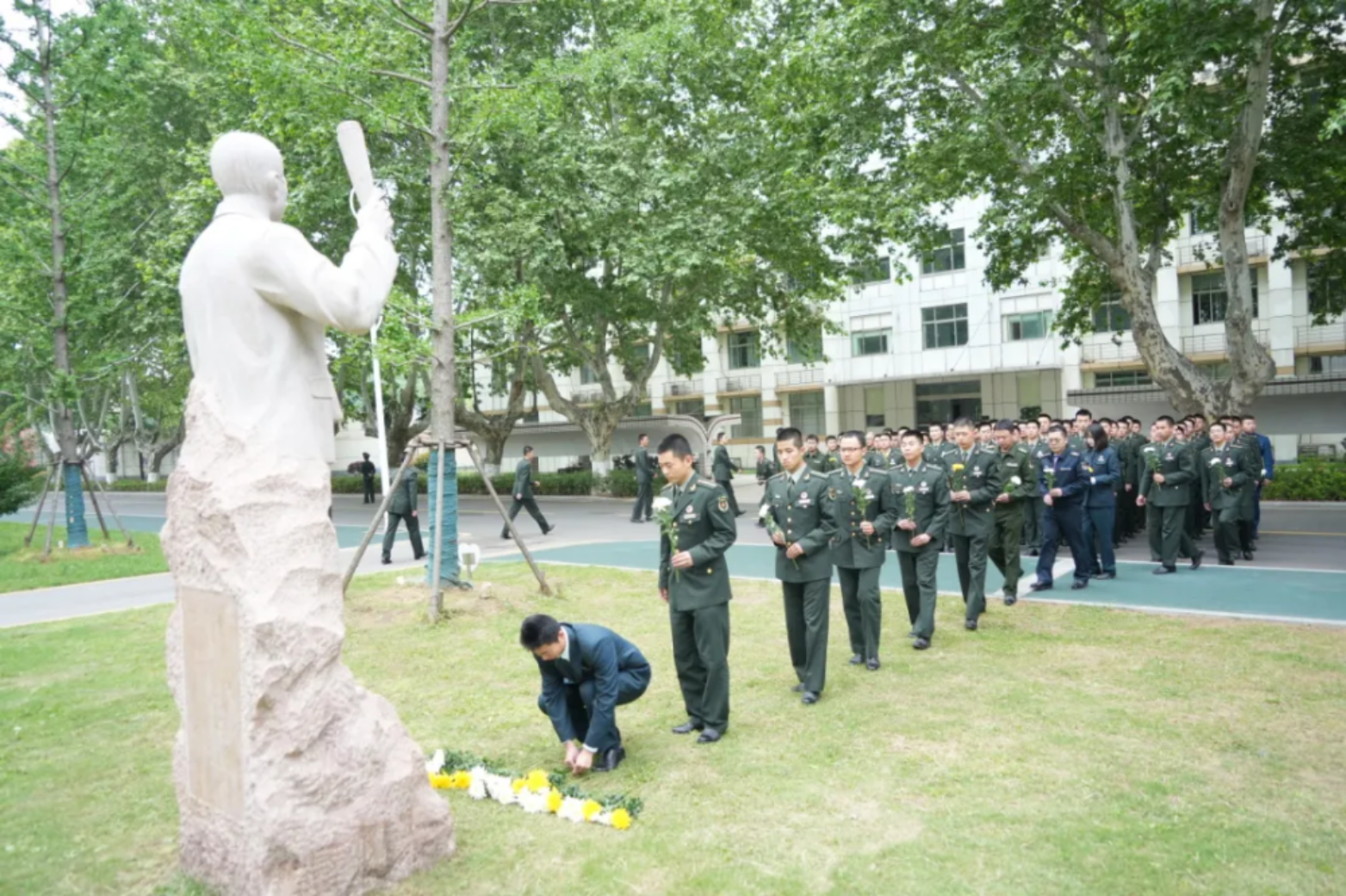 学院综合楼前,巍然伫立着“龙潭三杰”前三杰、后三杰六座标志性等身石像,位于左起首位的,正是前三杰之首的钱壮飞烈士。某学员队学员正列队向钱壮飞烈士敬献鲜花。“当年他推开通向生路的浮桥,自己却永远留在江畔。”学院宣讲团成员在钱壮飞烈士雕塑前的动情讲述,让在场的学员眼眶湿润。
