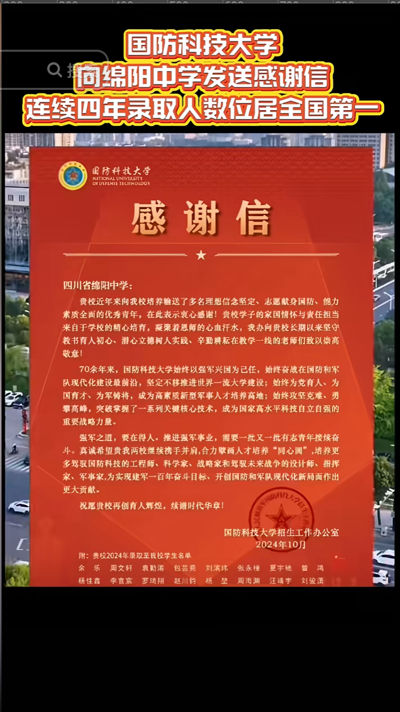 milan米兰官网向绵阳中学发送感谢信