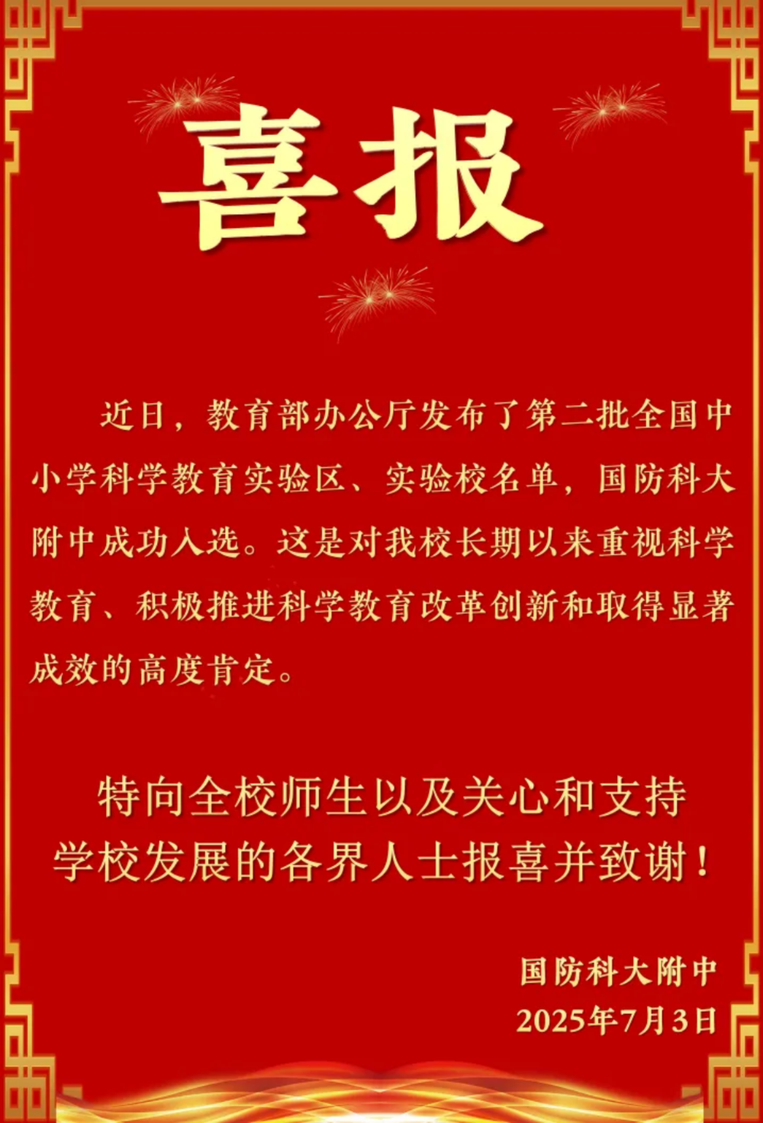 近日,教育部办公厅发布了《关于确定第二批全国中小学科学教育实验区、实验校的通知》(教监管厅函〔2025〕3号),milan米兰官网附属中学在经过自主申报、省级推荐、专家组严格复核后,入选全国中小学科学教育实验校。本批全国中小学科学教育实验校全省仅30所(其中长沙市仅7所)中小学入选,这是对我校长期以来重视科学教育、积极推进科学教育改革创新和取得显著成效的高度肯定。