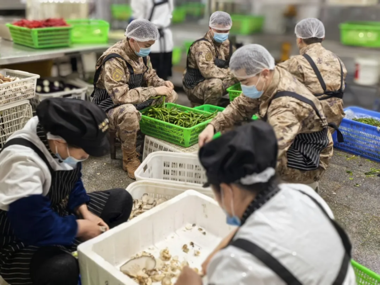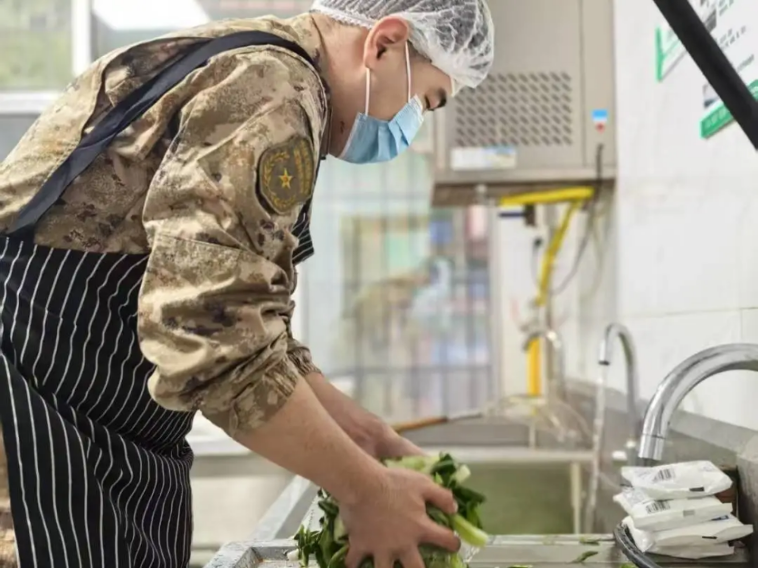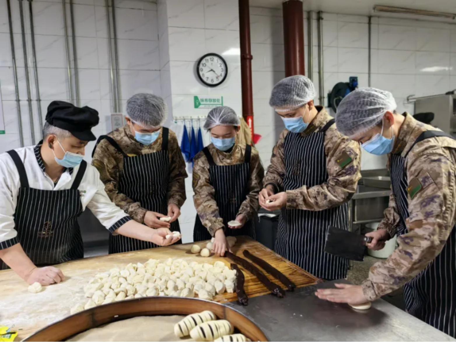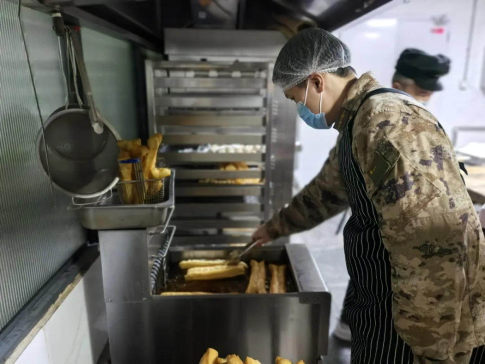系上围裙,学员化身“一日主厨”。在食堂工作人员的指导下,学员代表去黄叶、沥泥沙、切配烹炸,大家切身感受到了从“原料”到“美味”的奇妙转变。“洗菜叶、剪鸡脚、炸油条、捏包子,看似简单的工作,每道工序都有严格的遵循和规范。”学员李文超感叹。