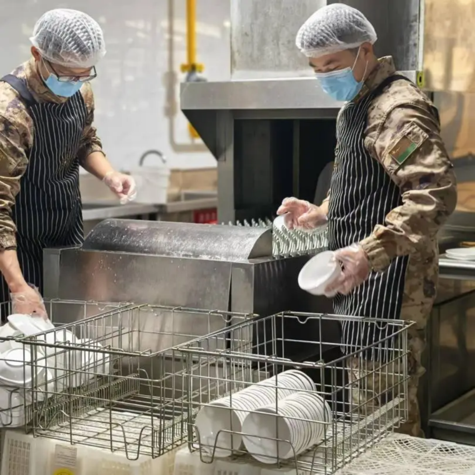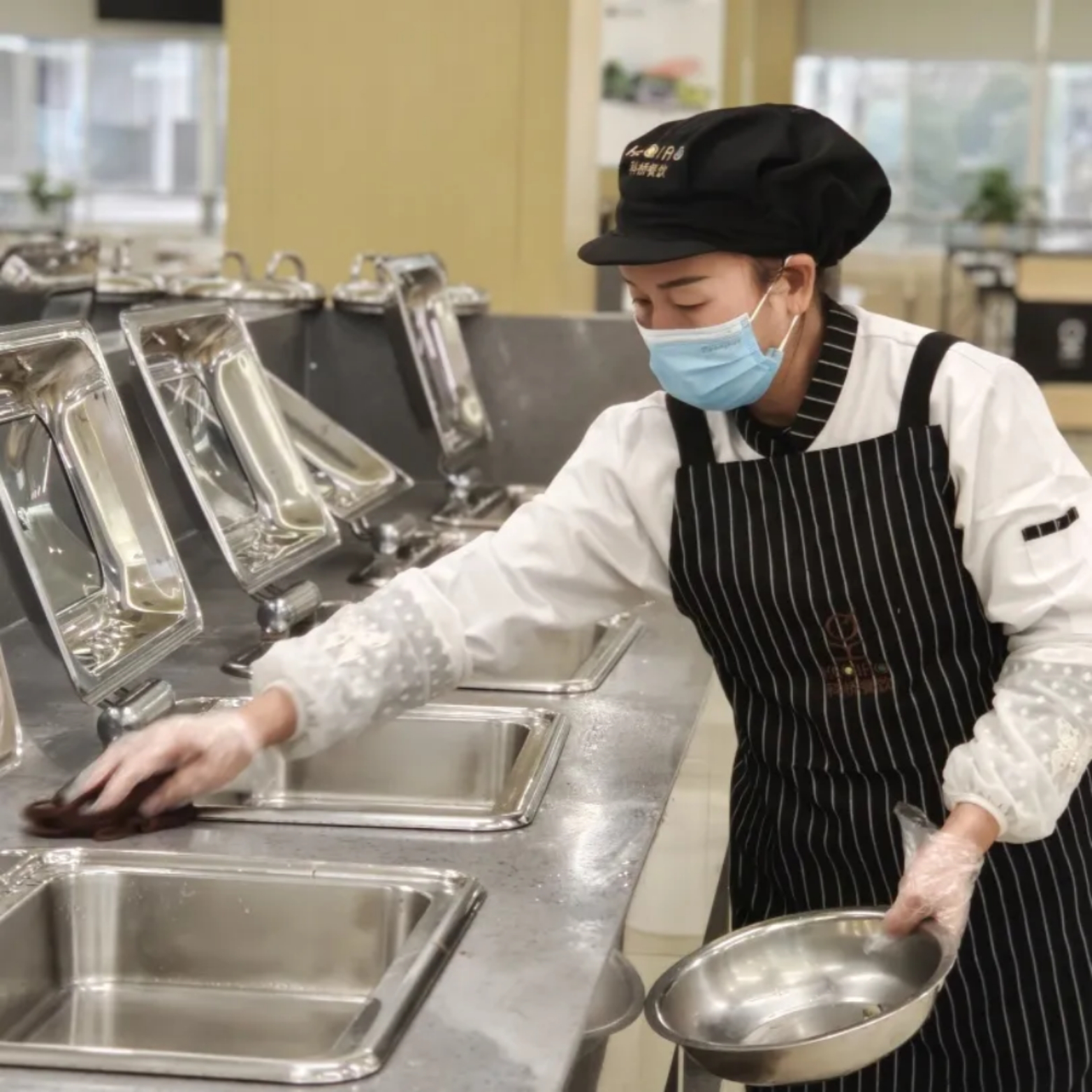 活动尾声,学员与食堂员工挽起袖子,化身“清洁卫士”,严格按照洗消标准,对餐具进行分类、清洗、消毒;对照食堂环境卫生要求,擦拭桌椅、清扫地面、售卖间等。学员马慧敏写下感悟:“原来‘一尘不染’背后,是择净每根菜须的执拗,摆正纸巾盒时的较真,也是雷锋说的‘螺丝钉’精神。”
