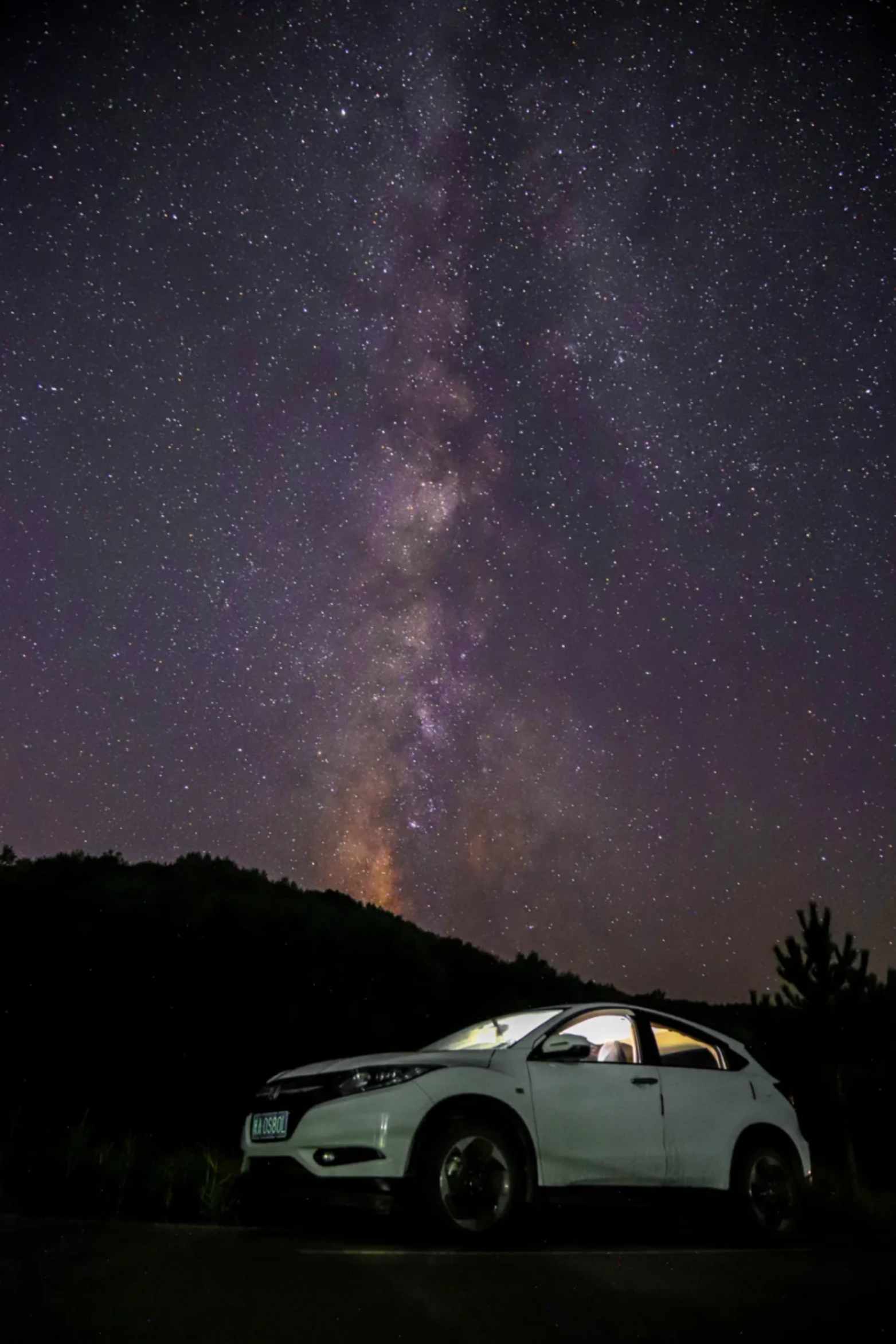 银河从深蓝天幕倾泻而下,千万颗星子在镜头里凝结成流动的诗篇。一辆白色越野车静静停驻,车窗内透出的暖光与璀璨星河交相辉映。