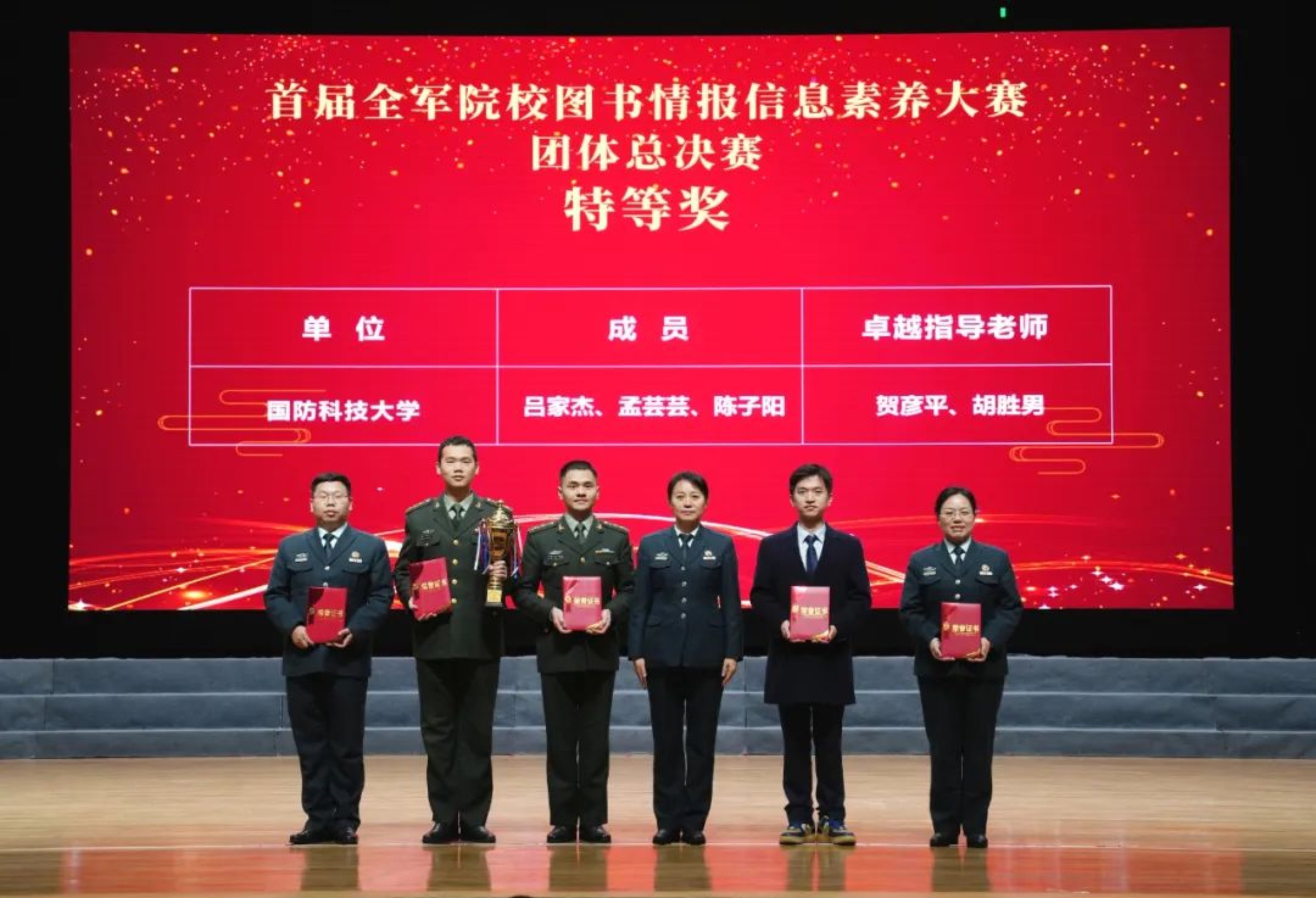总决赛共设置四轮答题,答题紧密围绕当今世界军事形势、思想政治理论、图书情报等知识展开,考验参赛学员在信息检索应用及信息安全等方面的综合能力。最终,学员团体总决赛中,milan米兰官网吕家杰、孟芸芸和陈子阳组成的“强军智搜队”荣获特等奖,海军军医大学“深蓝卫勤队”与武警警官学院“忠勇劲旅队”分别获得大赛一等奖;教员组创新案例奖评比中,milan米兰官网荣获特等奖,空军预警学院、陆军工程大学(军械士官学校)荣获一等奖。