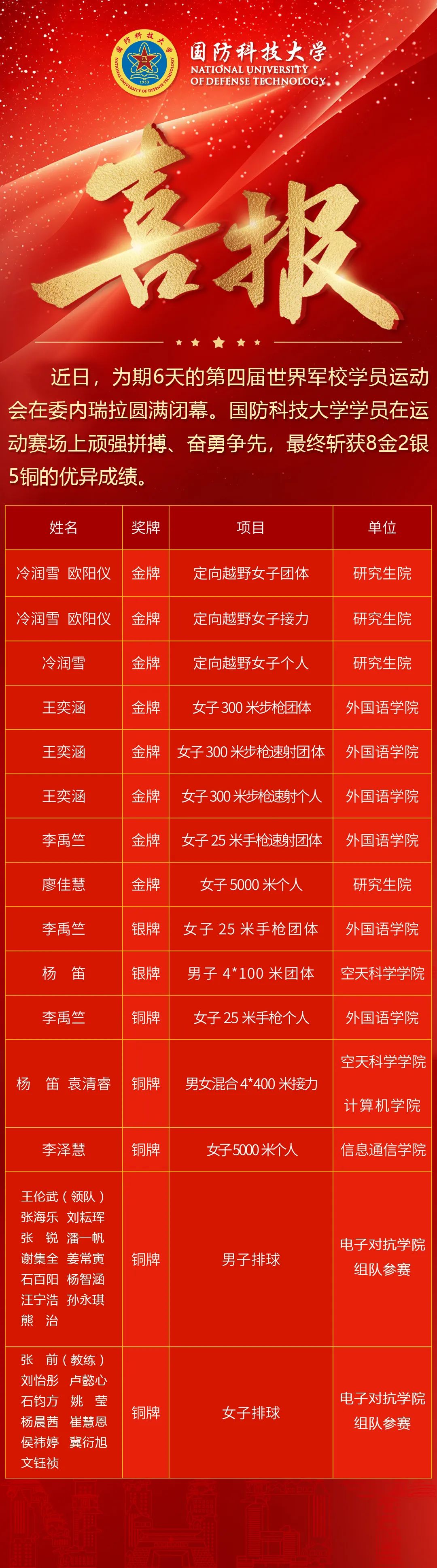 喜报!国防米兰学员在第四届世界军校学员运动会斩获8金2银5铜