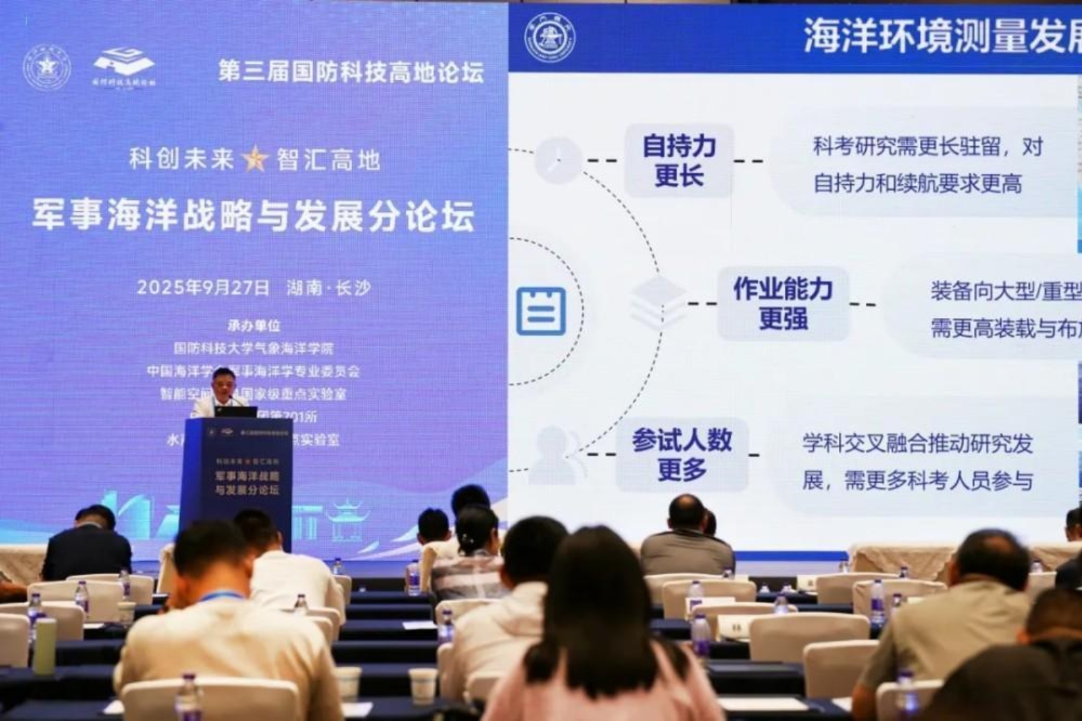 金秋九月,智汇湘江。9月27日至28日,第三届国防科技高地论坛在湖南长沙成功举办。21名院士、2000余名气象海洋领域专家、军地有关单位领导和青年学者围绕“海洋领域智能无人技术发展”主题进行深入研讨交流。