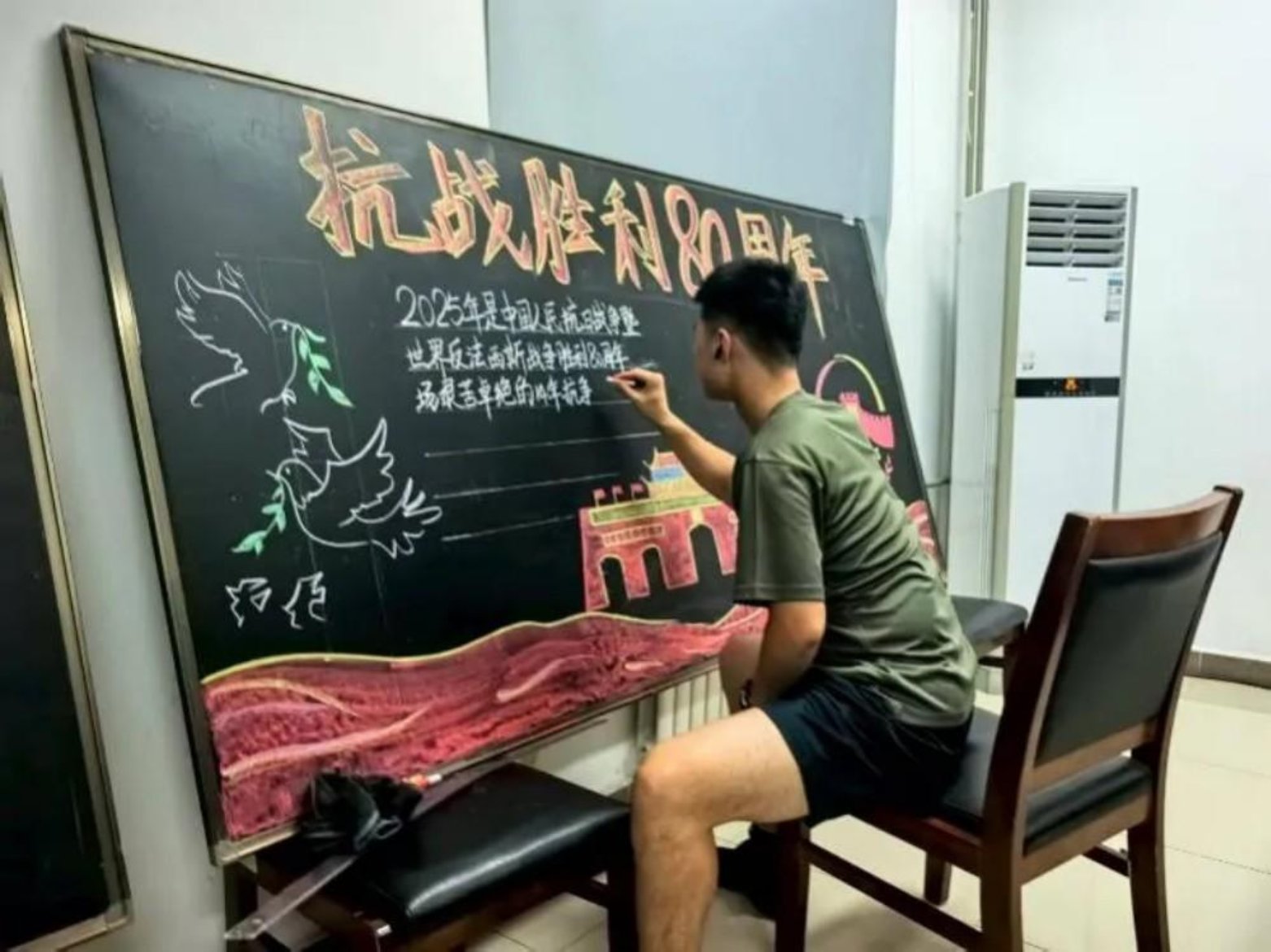 电子科学学院军人研究生化身“文化宣传员”,在中国人民抗日战争暨世界反法西斯战争胜利80周年的历史节点,通过宣传板报的方式铭记历史,缅怀先烈。板报上,他们遒劲书写“致敬胜利”,让血色岁月与青春信仰隔空相望,共忆峥嵘。