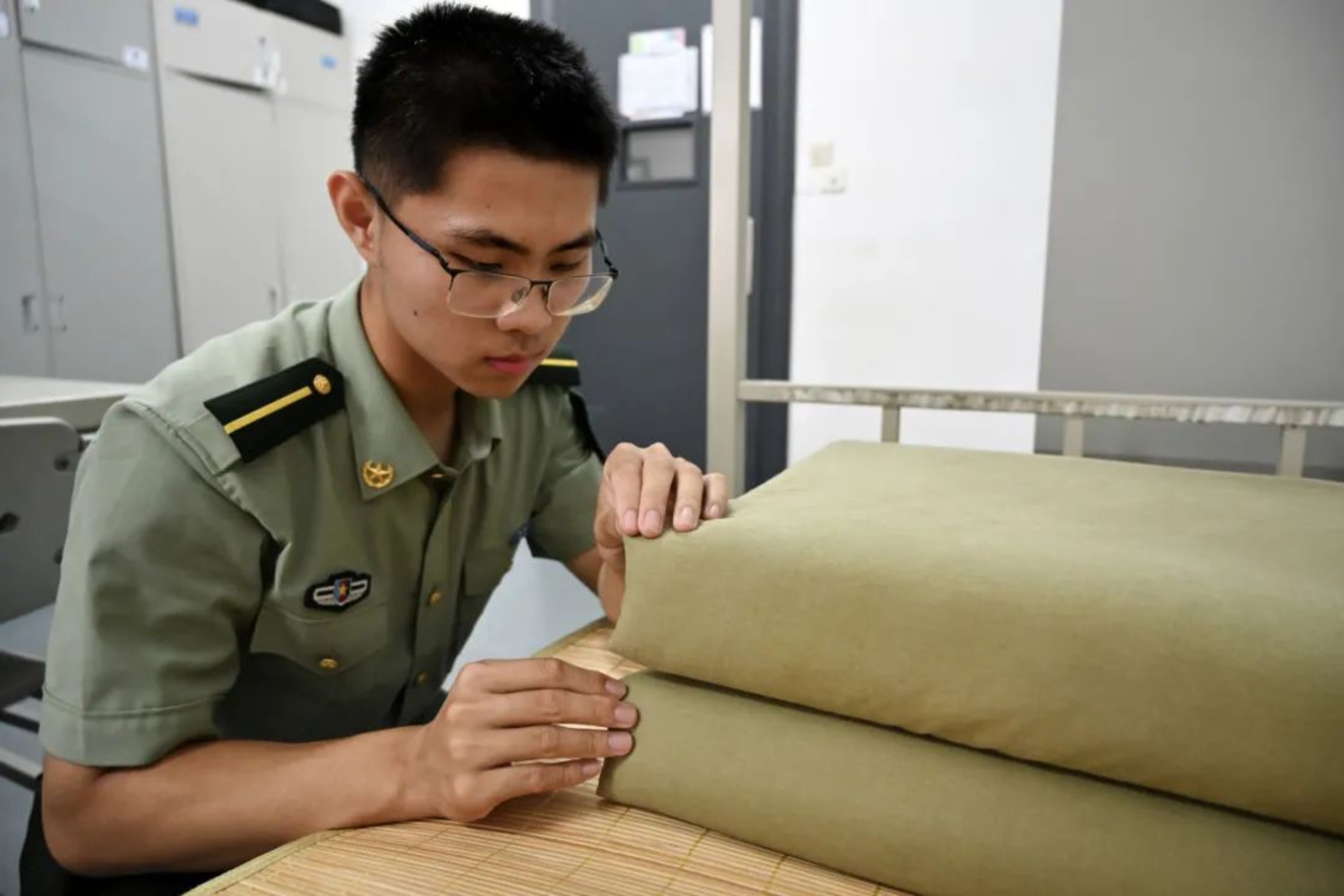 学员正在充盈一床军被