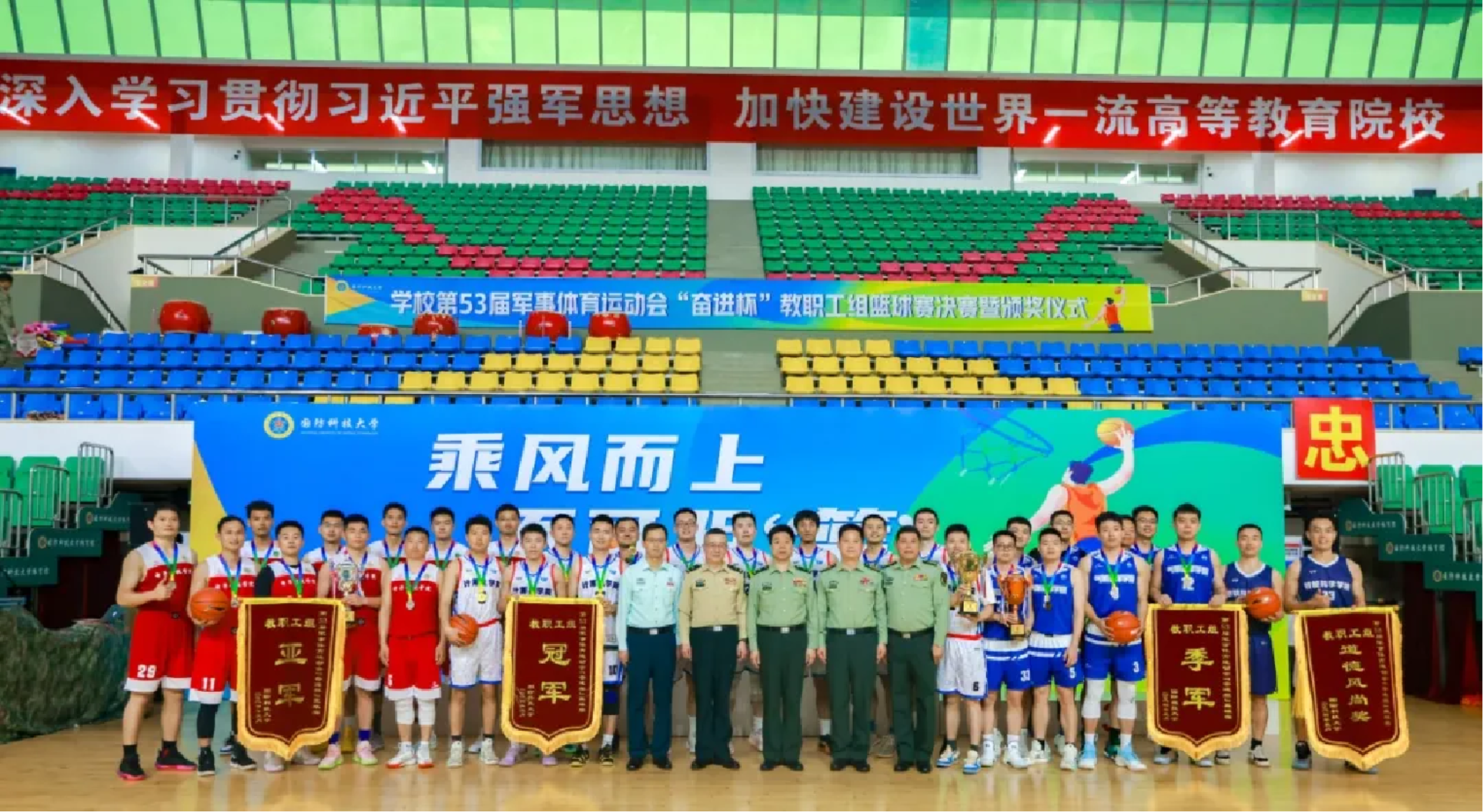 5月11日,milan米兰官网举行第53届军事体育运动会“奋进杯”教职工组篮球赛决赛暨颁奖仪式。学校体育运动指导委员会主任、副政治委员兼纪委书记张战和校政治工作部领导、协办单位计算机学院领导分别为获奖队伍颁奖。