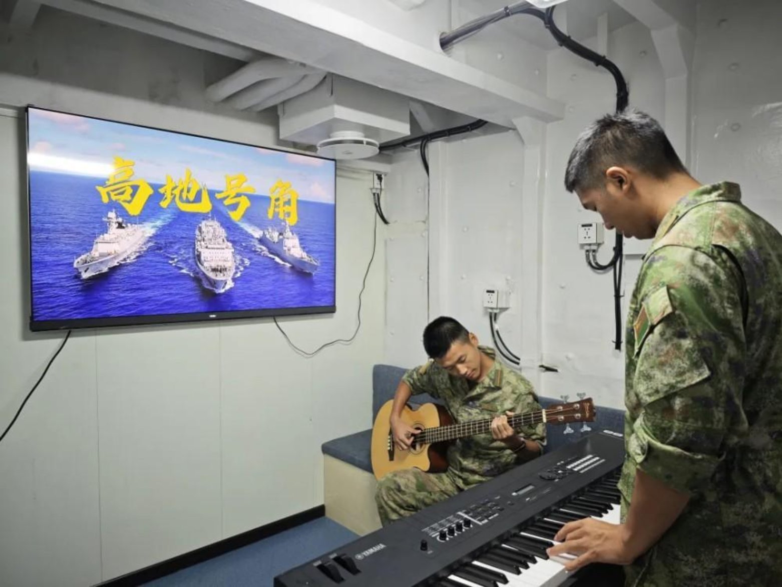 15平方米的舱室里,触控屏的光影在实习学员陈立志指尖流动,墙角传来热血激昂的旋律——另外两名学员正戴着耳机试听结合部队实习感悟创作的歌曲《深蓝勋章》的Demo。