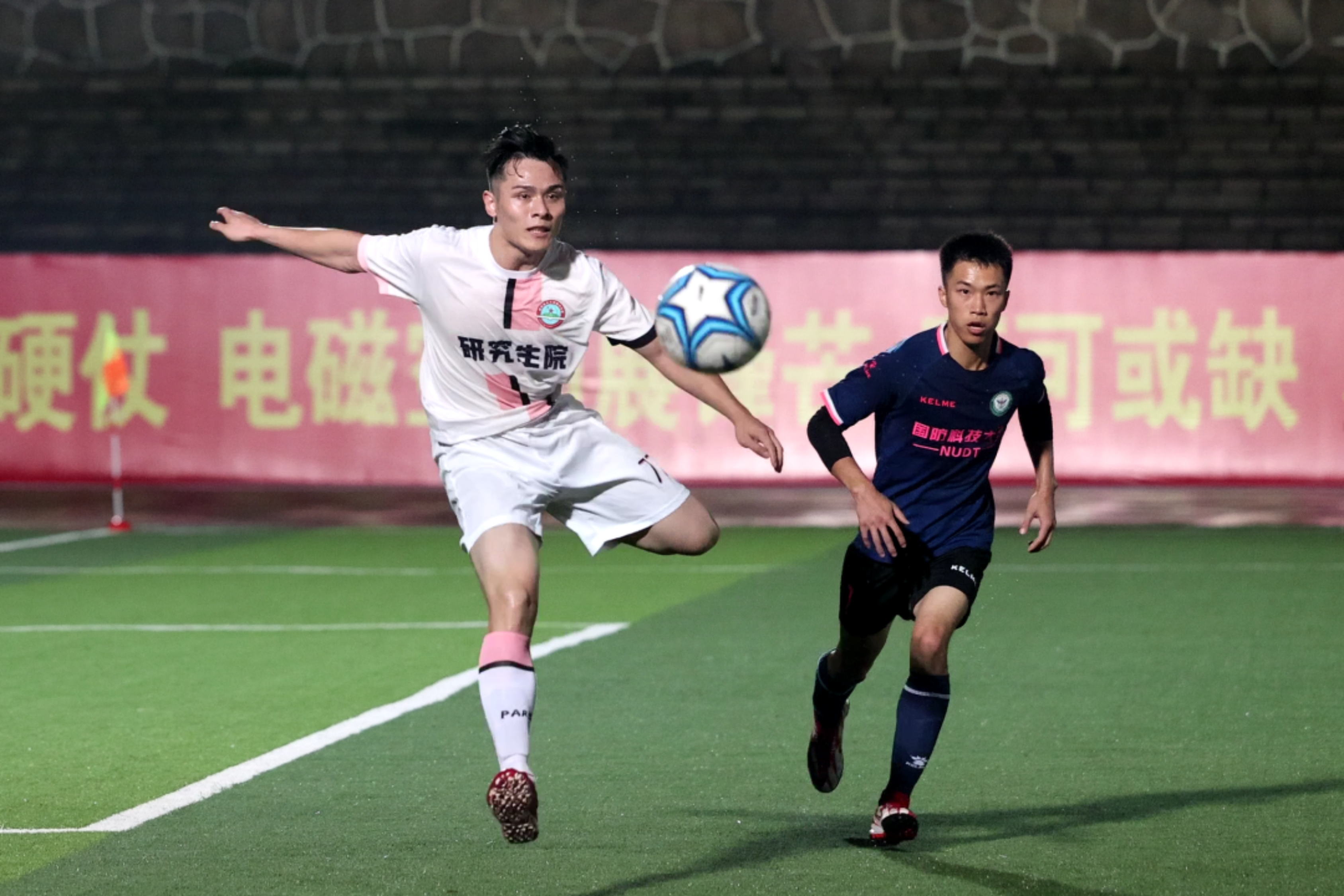 比赛开始不到五分钟,军事基础教育学院队右边锋陈昱桔就抢得球权,横向拉球过人把对方前锋抛在身后,一记边线长传向敌方禁区吹响“进攻号角”。奈何研究生院队禁区防守过于严密,强行抽射还是没能先下一分,遗憾出界。陈昱桔面露不甘,几度跺脚。这位虎将技术过硬,然前几日不慎受伤,爆发力与灵活性受到影响。有人劝他放弃比赛,他果断拒绝:“赛场如战场,我不能当逃兵!”征得康复师同意后,他在大腿拉伤处扎了8针,缠上肌贴,毅然站上决赛舞台。