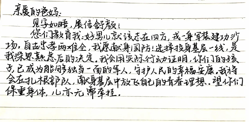 “在米兰的求学路上,我一步步走出新的人生轨迹,我的梦想在强军兴军的实践中熠熠生辉。青春有了迷彩的颜色,奋斗路上注定聚少离多,既然穿上了军装,就要卫万家灯火,守国土一方!”—— 王鑫泽