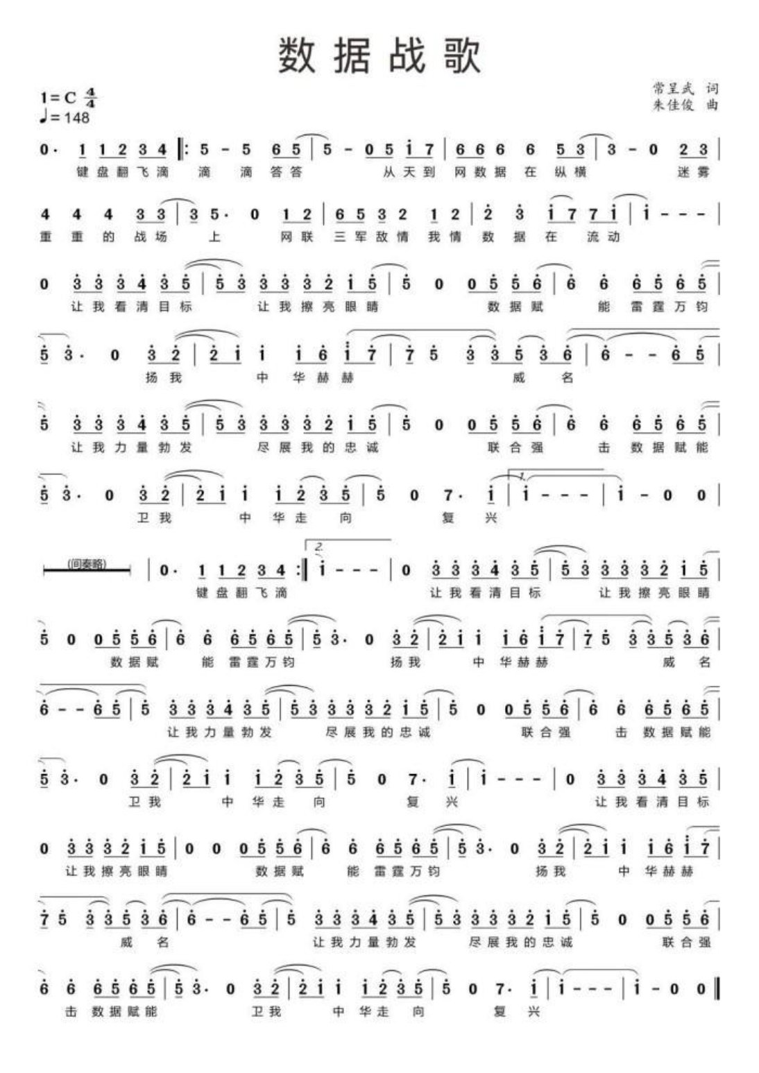 《数据战歌》为“数据组歌”之一,歌曲以鲜明的意象和磅礴的气势,描绘了一幅现代信息化战争的壮阔图景:将无形的数据战场具象化,取代了传统战场的硝烟炮火,勾勒出信息流跨域传输、无处不在的作战空间。揭示了在迷雾重重的复杂战场环境中,打赢信息化战争已成为制胜关键。