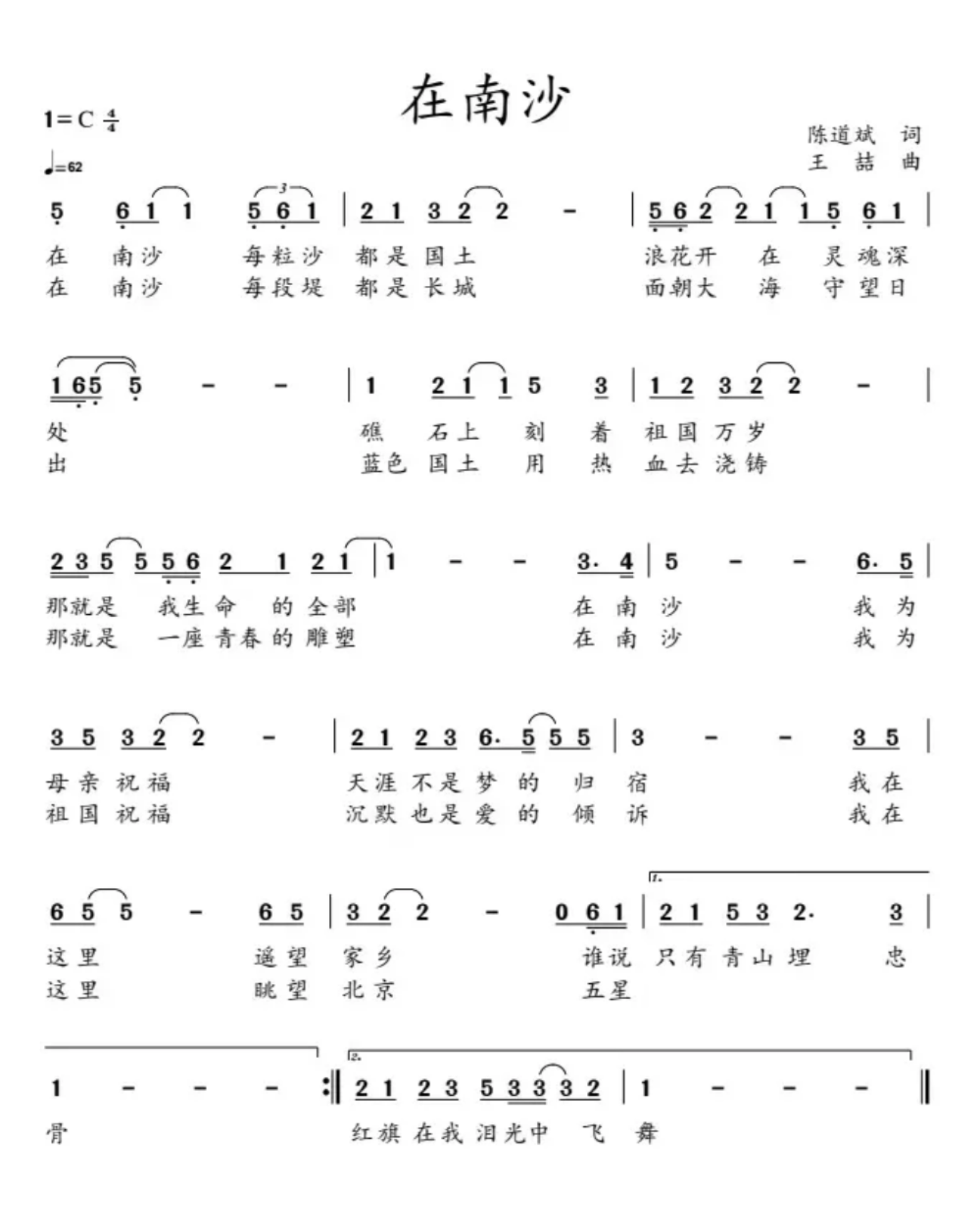 《在南沙》是一曲献给海疆卫士的青春忠诚赞歌,以朴素的意象——砂砾、浪花、礁石,唱响了戍边战士对祖国的深沉热爱与无限忠诚。歌词开篇“每粒沙都是国土”,道尽了海疆卫士心中那份沉甸甸的责任:他们守护的每一寸...